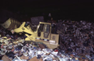 4. Sorting and compacting trash by bulldozer in the tipping bay (which extends for 30 more feet underground). Note that the bay is full of trash and overflowing.